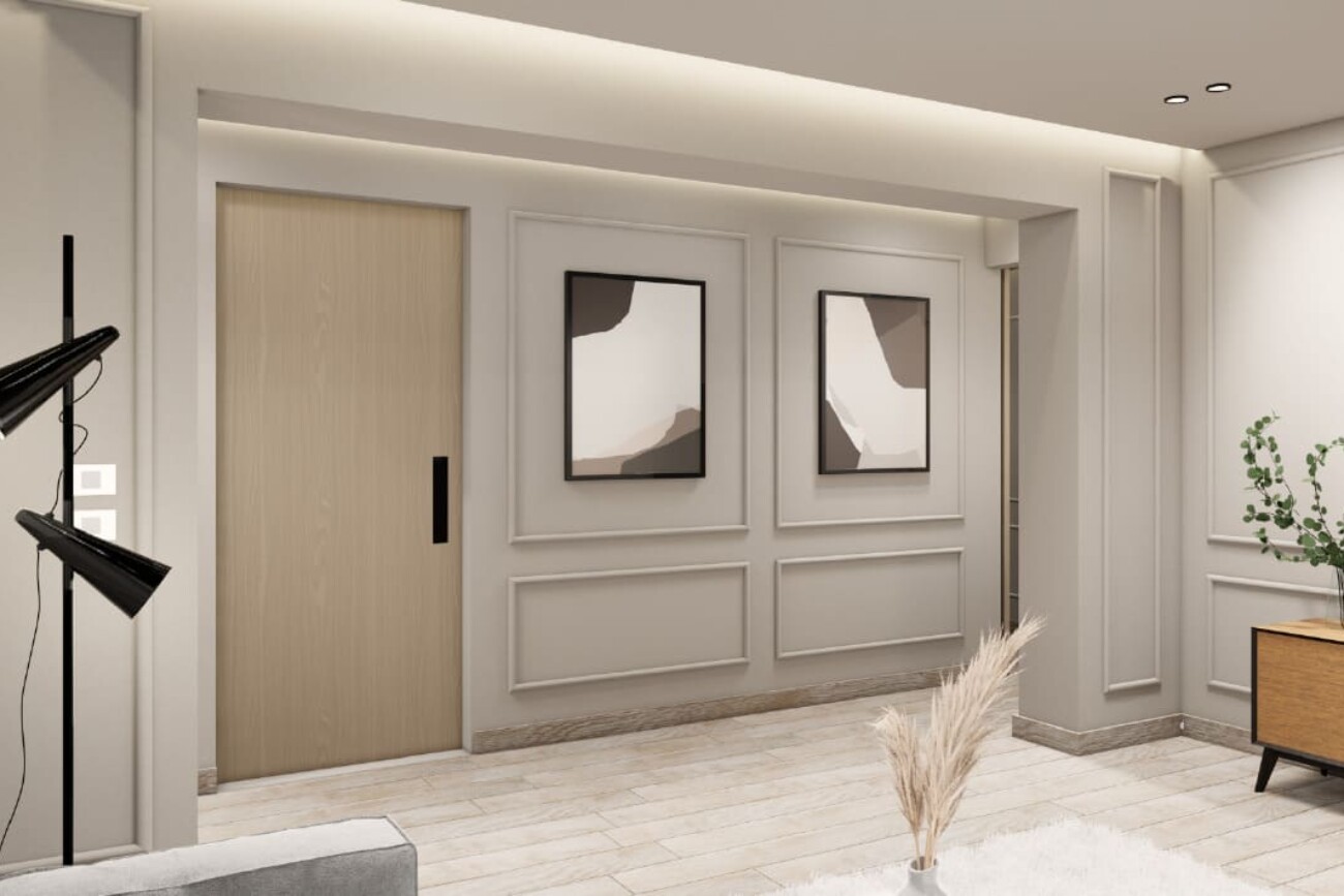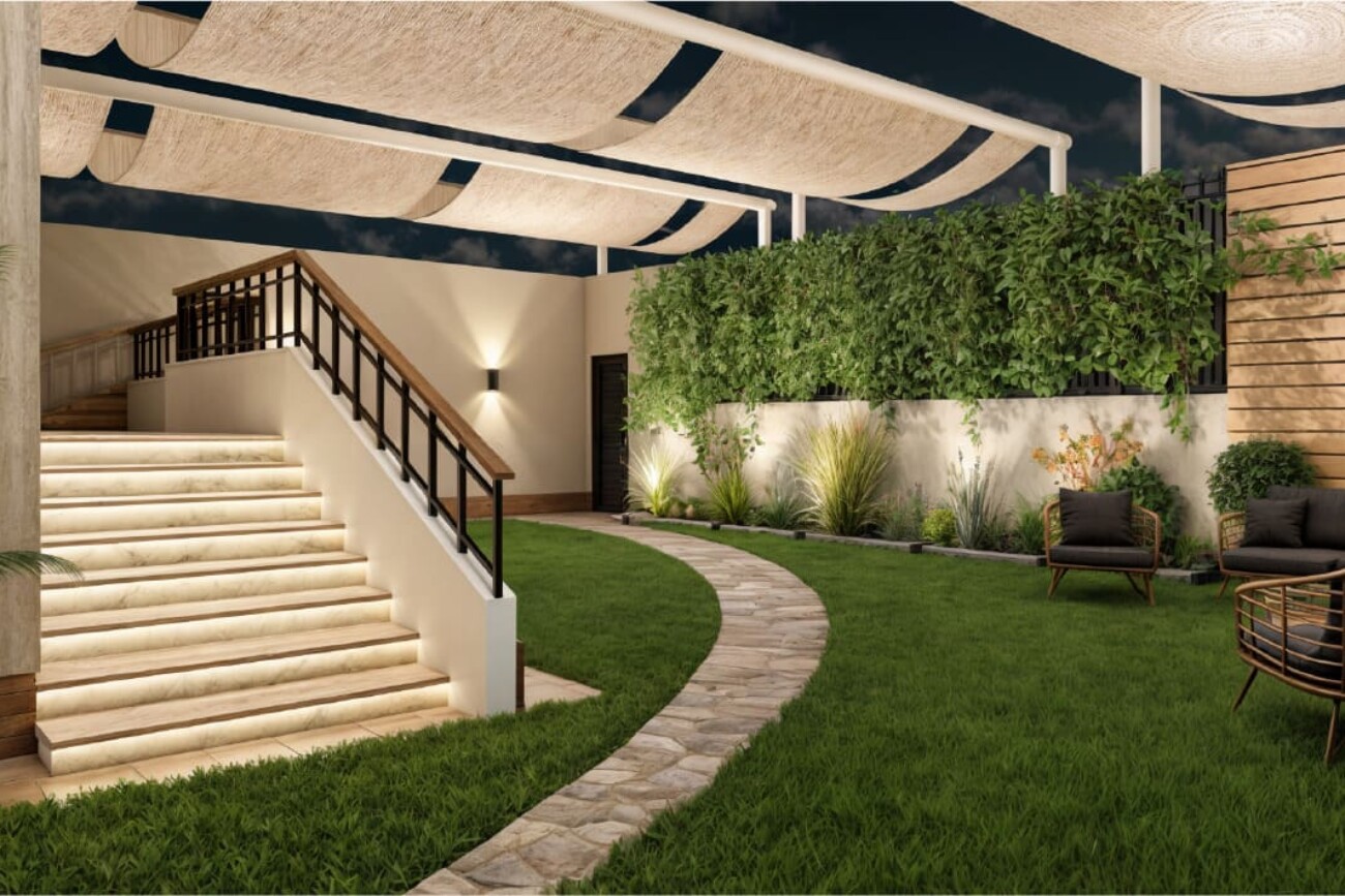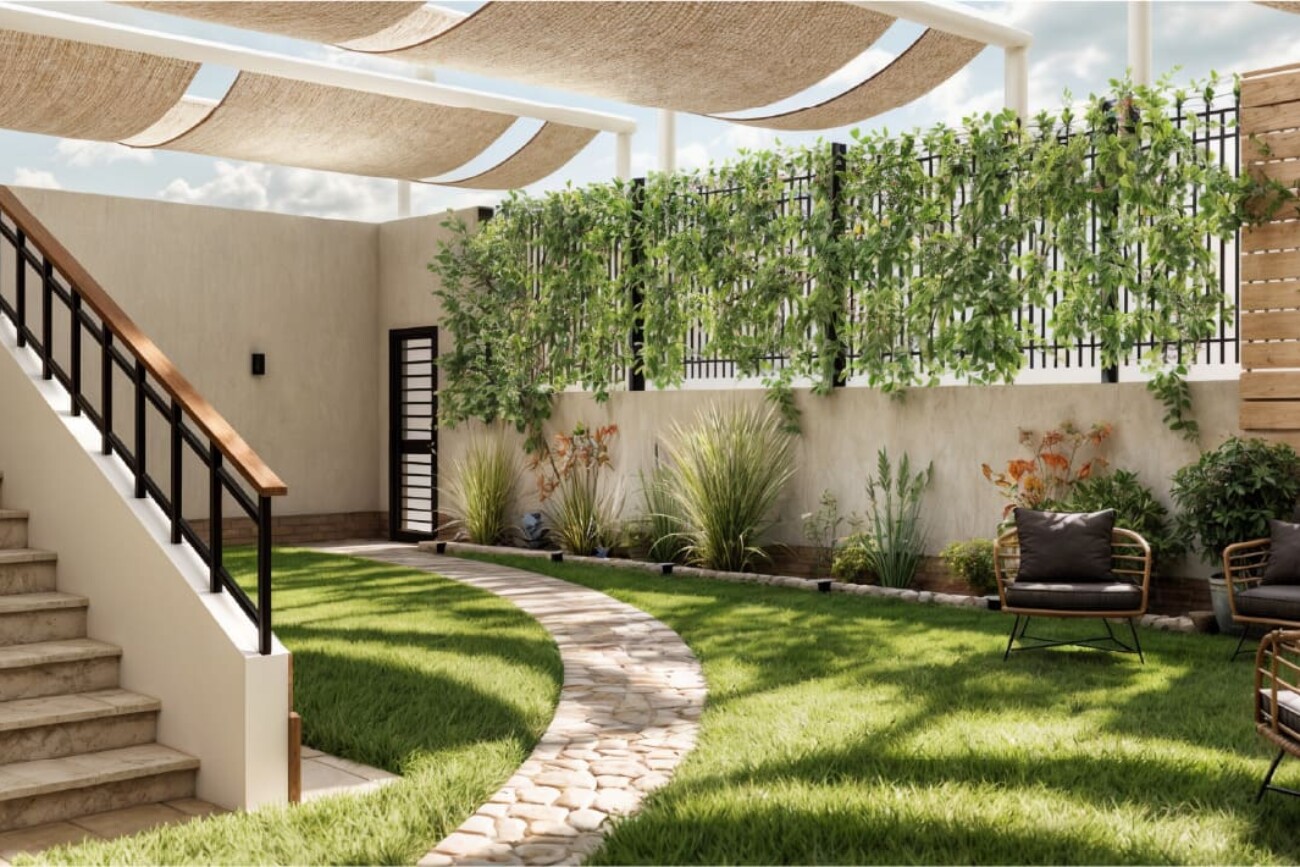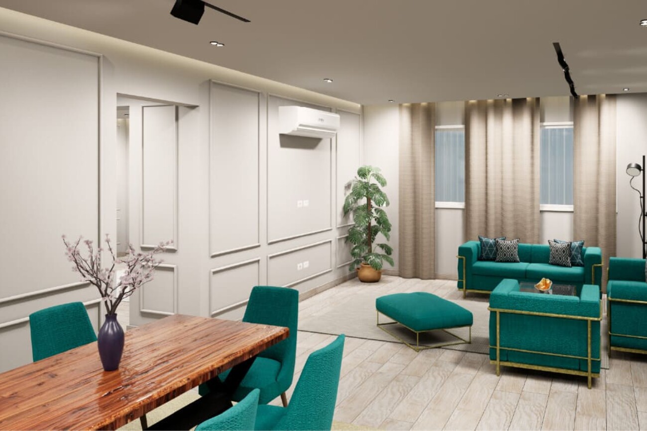The project involves designing a 3D interior for a ground floor apartment with a garden.