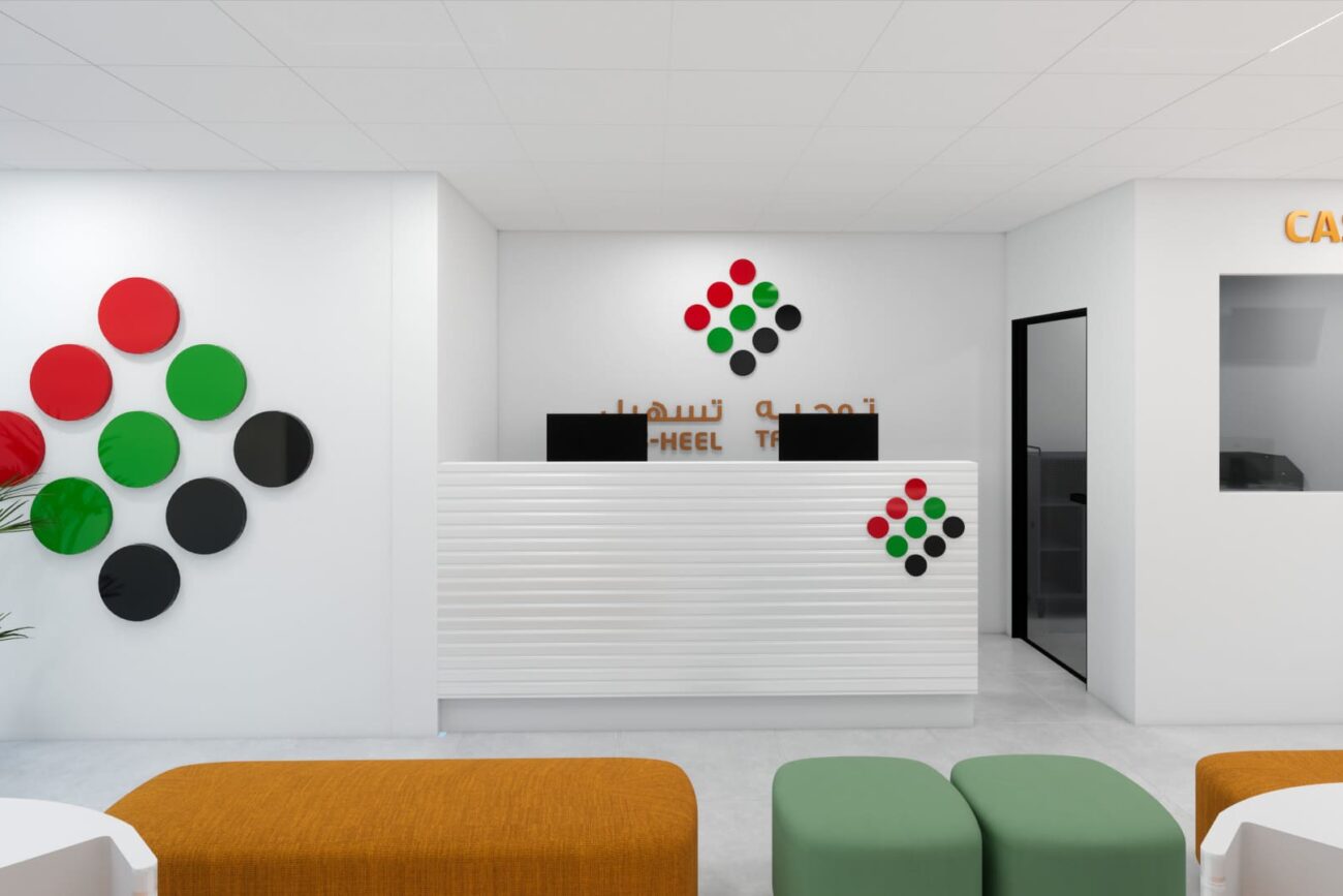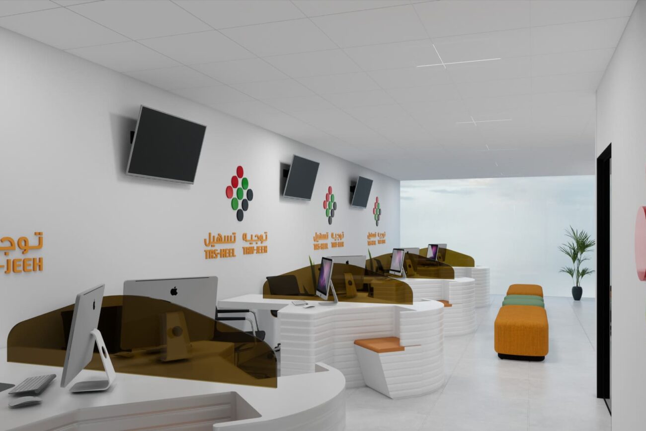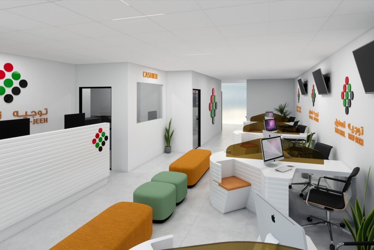 The project involves designing a 3D interior for Tawjeeh and Tasheel’s Dubai office, focusing on the reception area, training room, cashier area, and two offices.