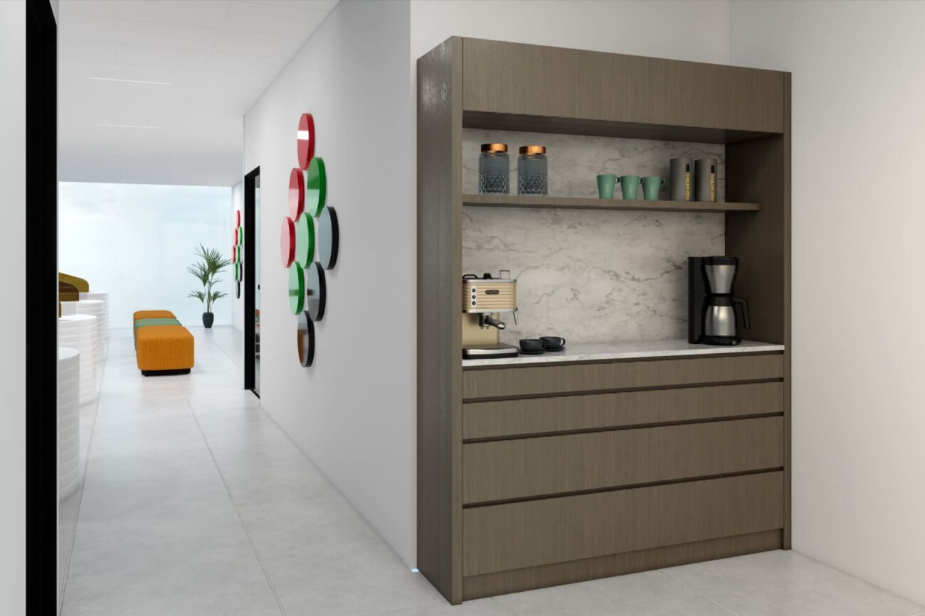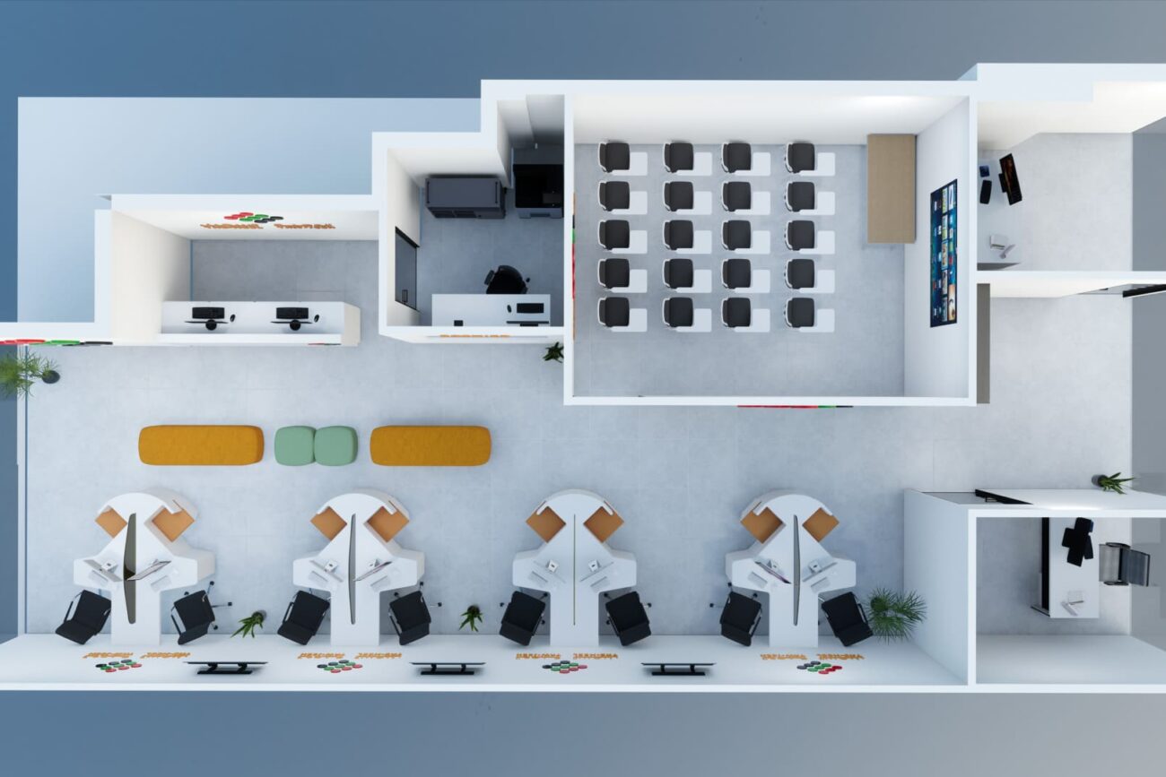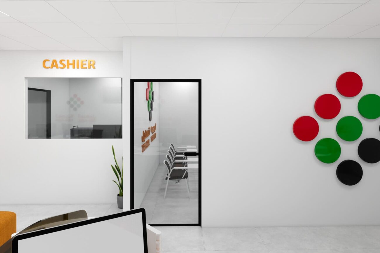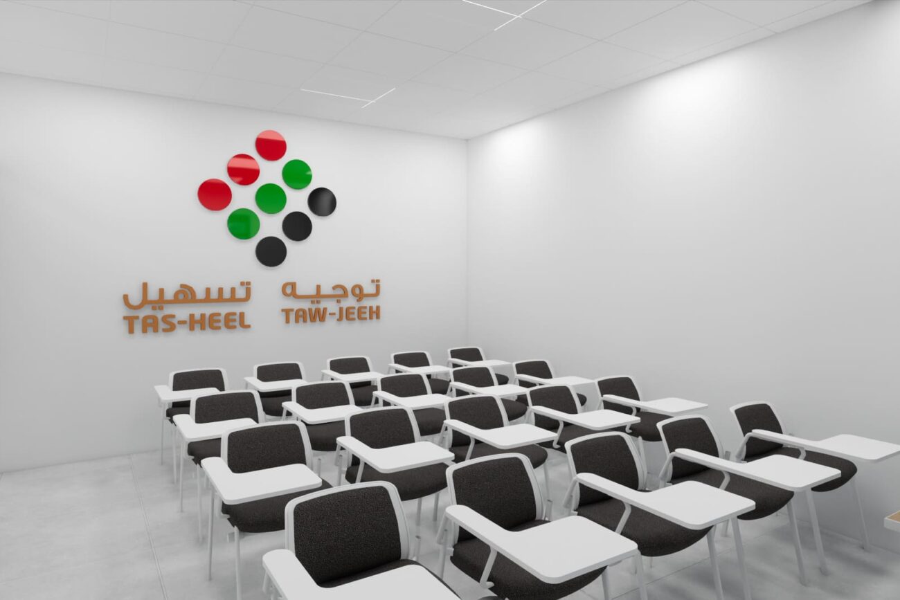 The project involves designing a 3D interior for Tawjeeh and Tasheel’s Dubai office, focusing on the reception area, training room, cashier area, and two offices.